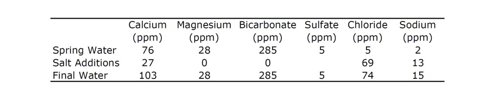 The mineral profile of the spring water, contribution of the salt additions and the final water profile was as follows.