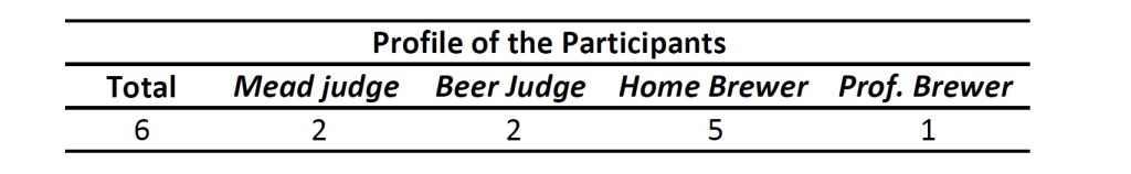 There were 6 participants and 26 triangle tests were completed overall. We had a good selection of mead experts and mead enthusiasts. There were two BJCP certified beer judges and two BJCP mead judges.