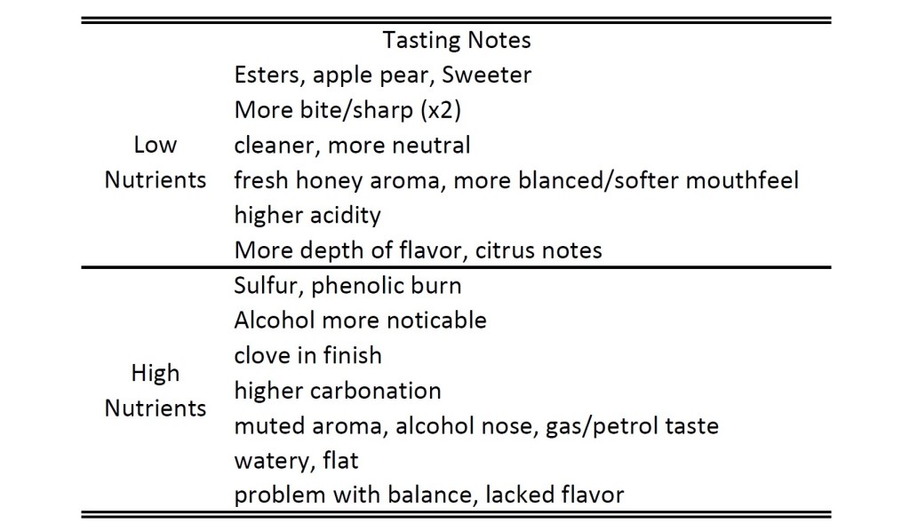Basically, the fermentation with the low nutrients took twice as long to ferment. Throughout the fermentation, the low nutrient regime smelled more like honey, whereas the high levels of nutrients has more pear and apple esters.