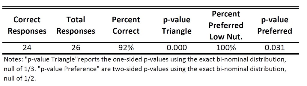 There was a significant difference between the two meads. Out of the 26 triangle tests 24 could identify the odd mead out! A test that the results were from random guessing is rejected with near 100 percent confidence. Moreover, all participants preferred the low nutrient rates. The null hypothesis of equal preference between the meads is rejected with 96.8 percent confidence. Here is a summary of the results.