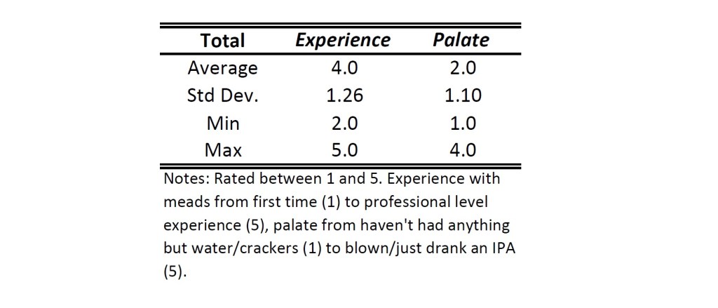 One scoresheet was filled out by each participant for each experiment. Participants were asked their experience level with meads, how blown their palate was, and their status as judges and home/professional brewers. Experience was given a value from one to five where one is first time having a mead to five being well-experienced. Palate was given a value from one to five where one is having had nothing to drink yet, and five was that they’ve already had too much (like just drank an IPA and sitting in a brewery). Participants were asked to say which mead they preferred and just select one if they couldn’t tell the difference.