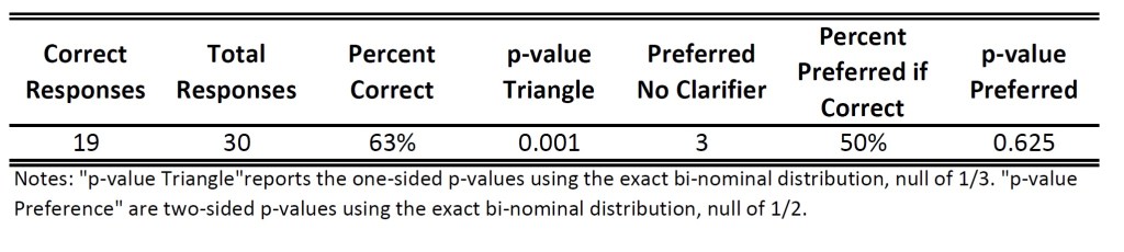 There was a significant difference between the two meads. In 19 of the 30 triangle tests, participants could identify the odd mead out! The null that the results were from random guessing is rejected with 99.99 percent confidence. However, participants were split on the mead that they preferred. The null hypothesis of equal preference between the meads is unable to be rejected. Here is a summary of the results: